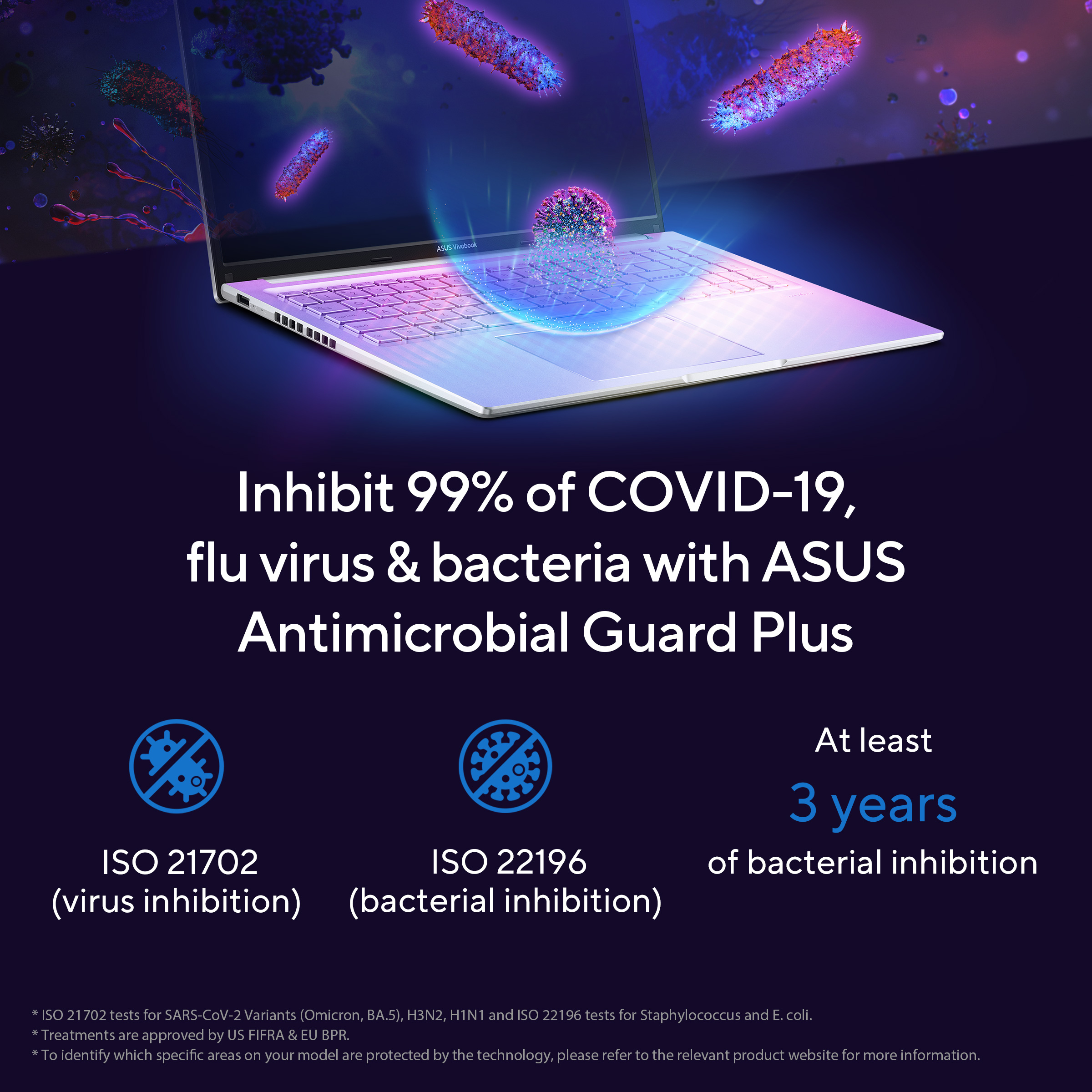 Tout est plus fluide grâce au puissant ASUS Vivobook 16, l'ordinateur portable doté de nombreuses fonctionnalités intuitives, notamment une charnière 180°, un cache webcam physique et des touches de fonction dédiées pour activer ou désactiver votre micro. Votre santé est entre de bonnes mains grâce à ASUS Antimicrobial Guard Plus qui protège les surfaces fréquemment touchées, tandis que le pavé tactile plus grand est maintenant plus agréable à toucher. Appréciez la force tranquille du Vivobook 16 !